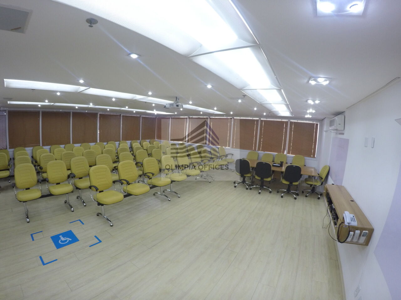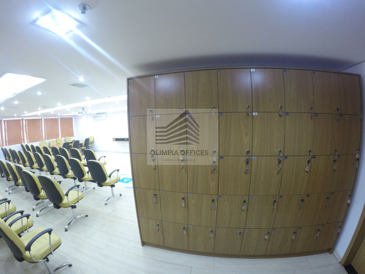 O edifício possui, ampla recepção, catraca facial, sala de espera, 3 elevadores, auditório acomoda 70 pessoas, 1 copa com geladeira, micro-ondas, filtro de água, maquina de café (Nespresso), ar condicionado, projetor, impressora, 40 armários com chave, 1 mesa de reunião, persianas nas janelas e banheiros.